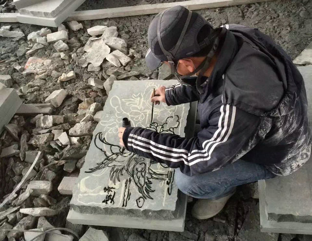 (浮雕雕刻之前需要在石材上繪出相應圖案)