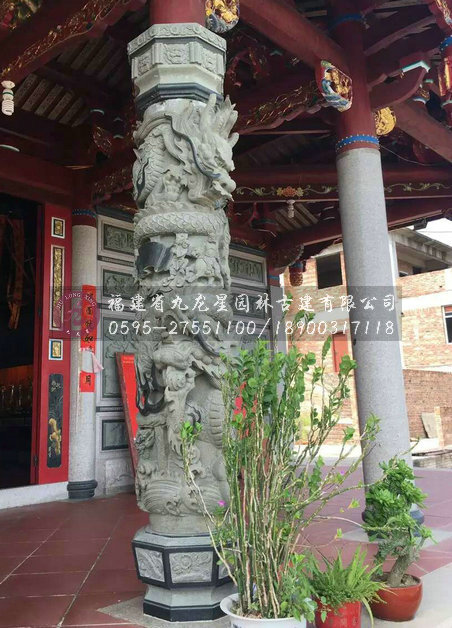 青石龍柱自清代以后大量出現,因青石“韌”,宜精雕細刻。若按鏤雕深淺計算,具體可分為蟠龍柱、人物柱、花幕柱、八仙柱等;龍柱則又有淺浮雕與高浮雕之別,“白龍”柱基本是淺浮雕,而“青龍”基本是透析度極高的高浮雕。在龍的數量上區分,有單龍的盤繞柱,雙龍戲珠的柱子。而最為別致的是,“福龍”系列中聚成了閩南石雕龍柱的靈魂、寄托閩南人民的希望的“翻天覆地龍柱”。此外,可以按石柱本身的形狀分為方柱、八棱柱、六棱柱等等。