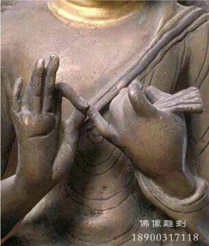 佛像的各種手勢代表佛像的不同身份,表示佛教的各種教義,是具有印度特點的人體語言,表達的含義極為豐富。常見的有說法印、無畏印、與愿印、降魔印、禪定印5種,即“釋迦五印”。手印形式可有多種變化,尤其是密教手印多達幾百種,變化莫測,見的有智拳印、期克印等。