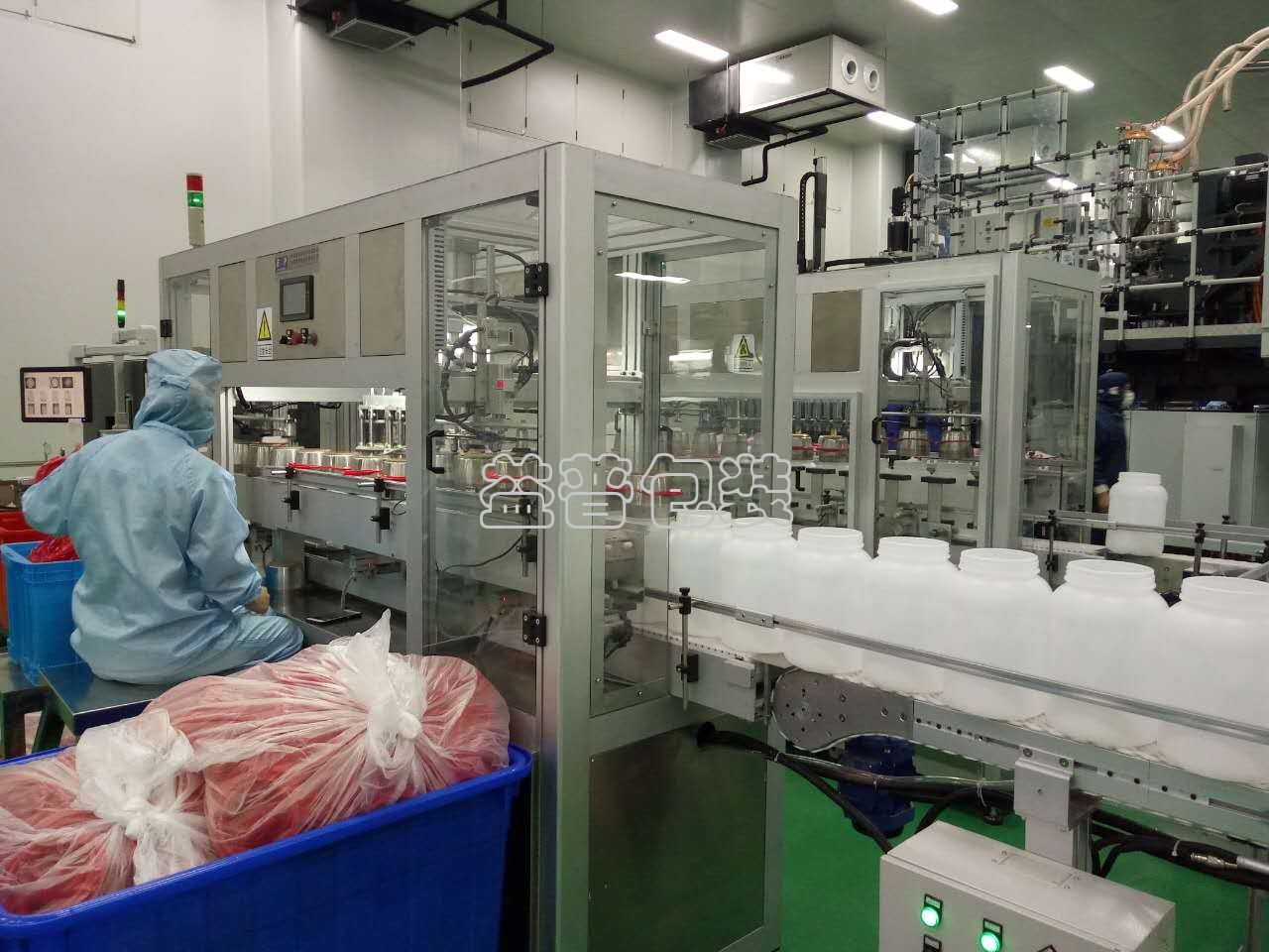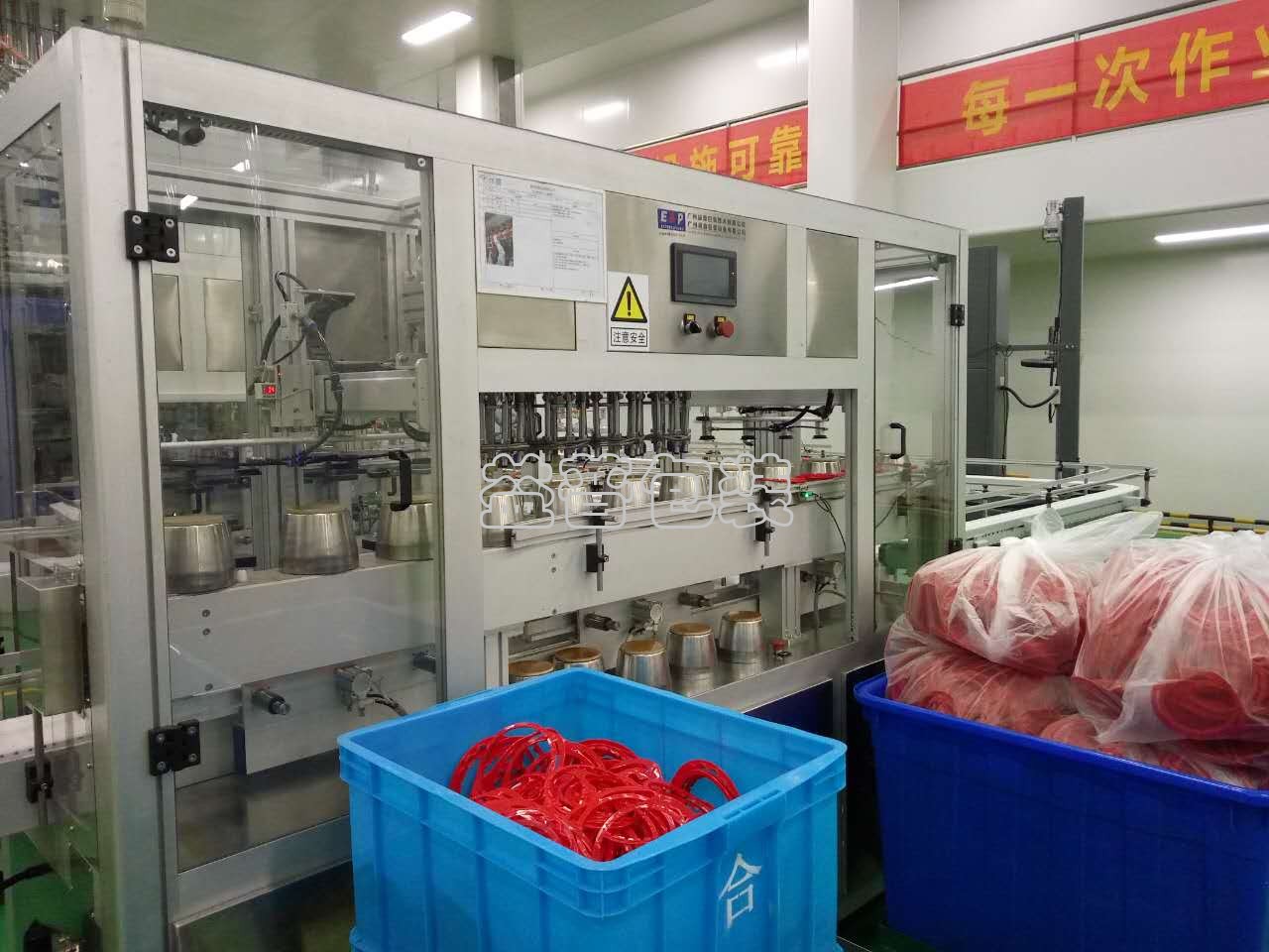 設備由進瓶輸送線,模具輸送線,放模具裝置,壓提環裝置,取模具裝置,模具,定位裝置,架體,控制系統等組成。