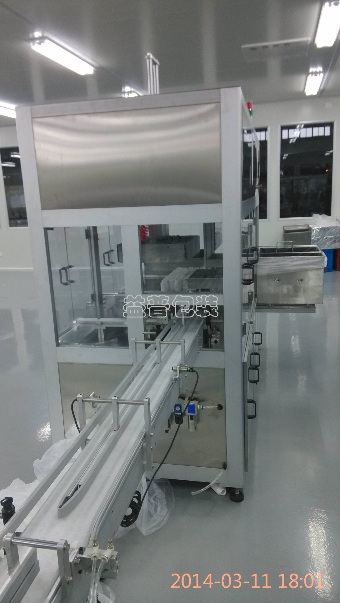 產(chǎn)品由進(jìn)瓶輸送線送入排瓶推移工位,排瓶推移機(jī)構(gòu)將整排推入排瓶臺(tái)。達(dá)到設(shè)定的行列數(shù)時(shí),抱夾升降平移機(jī)械手將整層瓶抱夾裝入周轉(zhuǎn)箱中的塑料袋內(nèi)。裝滿設(shè)定的層數(shù)后,人工將套好袋的空周轉(zhuǎn)箱推入裝袋工位,同時(shí)滿箱將推至取出工位,工人完成封口后將滿袋取出。并重新套上空袋。周轉(zhuǎn)箱套袋、滿袋封口及從周轉(zhuǎn)箱取出由人工完成,只需一人操作。